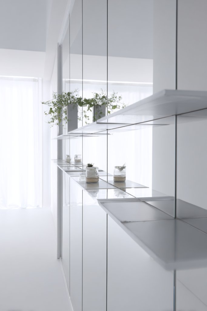 14. Mirrored Shelving Units for Storage and Reflection