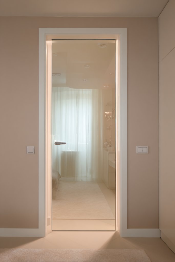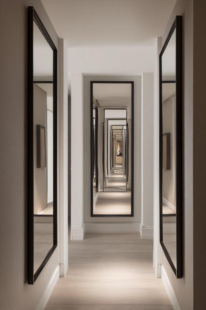 Imagine narrow doorways outlined with thin strips of mirror, reflecting the adjacent room and creating an illusion of width. When you open or pass through, the mirror captures movement and light, making the space seem more expansive. The reflective strips blend seamlessly into the architecture, adding a touch of modern elegance while enlarging the visual footprint.