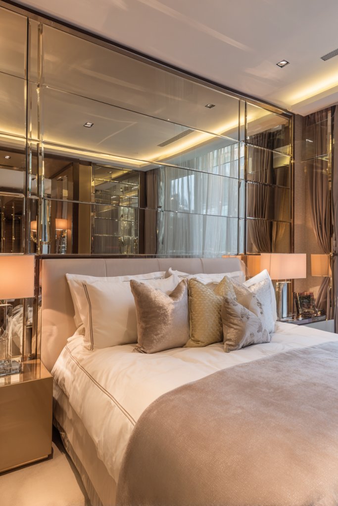 20. Mirrored Headboard for Bedroom Illusion of Space