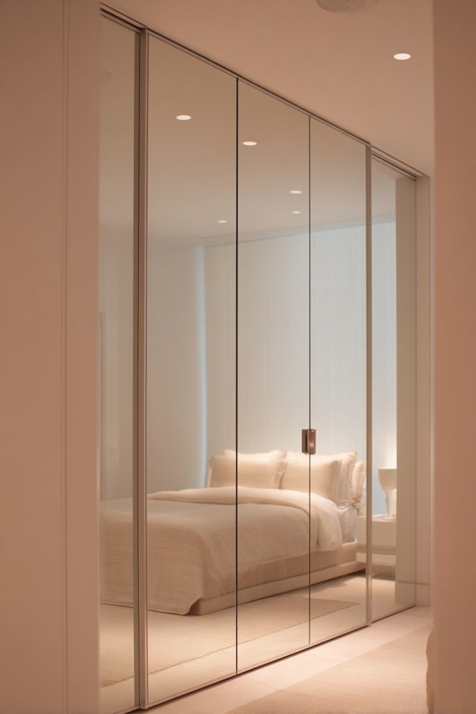 Imagine sliding open a door that reveals a closet full of organized essentials, all reflected in a large mirror. The glossy surface not only reflects your room but also amplifies natural light, brightening the entire area. The smooth motion of sliding doors creates a modern, clutter-free vibe, while the mirror surface adds depth and dimension. It’s like hiding storage in plain sight, with a touch of elegance.