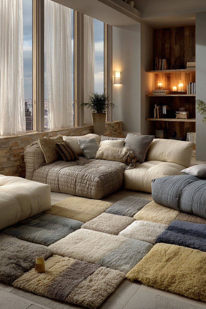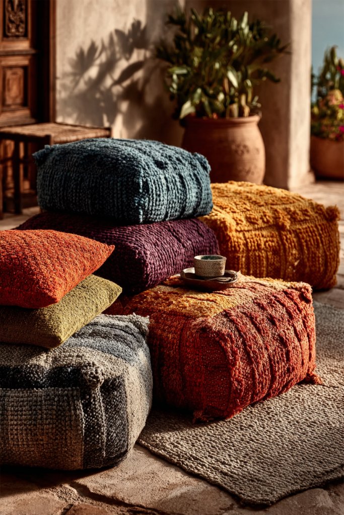 Picture oversized poufs in textured fabrics—woven, embroidered, or leather—scattered around a low table or in a corner. Woven floor cushions in earthy tones or bold patterns add layers of comfort and color. They’re easy to move around, letting you reconfigure your space quickly. The informal setup encourages lounging and conversation.
