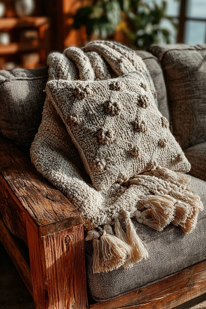 Picture a soft, cream-colored throw with chunky knit textures and playful fringed edges draped over a sofa arm. Alternatively, a woven blanket with knotted tassels adds a boho charm. The tactile textures create visual interest and invite you to touch. When casually tossed, they add layers and depth, transforming the look of your seating.
