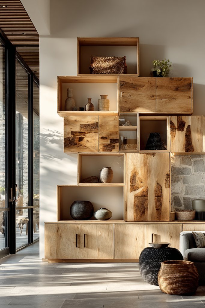 Visualize a sleek unit with a combination of open cubbies filled with baskets, books, or decorative objects and closed cabinets hiding less attractive essentials. The mix of textures—wood, matte finishes, woven baskets—adds visual richness. The arrangement creates a balanced, modern look that adapts to your needs.