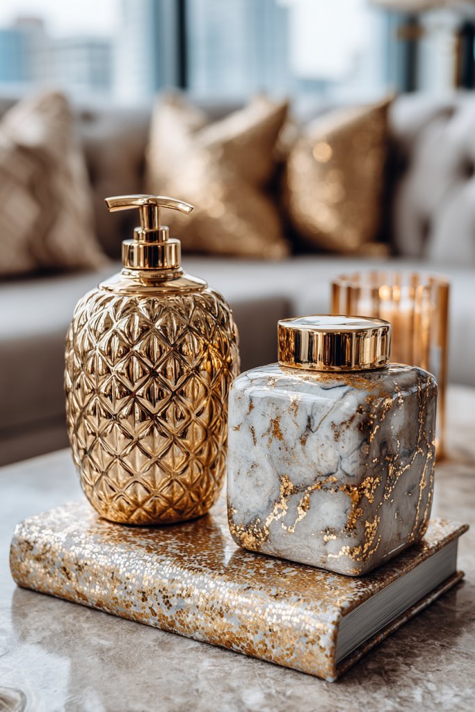 Imagine a matte black or brushed brass coffee table with clean lines, accented by gold-tipped vases or candleholders. The metallic elements catch the light and add shimmer, creating a sophisticated contrast against matte or natural textures. The reflective surfaces add depth and visual interest, making your decor pop.