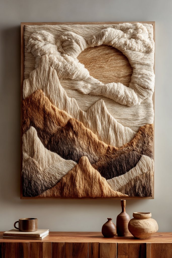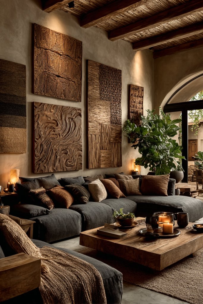 Picture a wall adorned with a large, woven textile in warm earth tones, softly draping down like a piece of art. Or imagine an abstract wall sculpture made from natural materials like wood or clay, giving a tactile, organic presence. These elements add visual intrigue and a sense of handcrafted authenticity, making your space feel curated and warm.