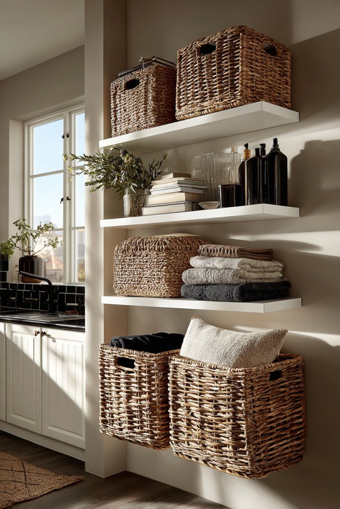 Envision slim, matte-finished shelves mounted against a neutral wall, with woven or textured baskets neatly tucked underneath. The baskets conceal everyday items, while the open shelves display curated decor—like ceramics, books, or small sculptures. The natural fibers and simple lines create a calm, organized vibe that feels modern yet warm.