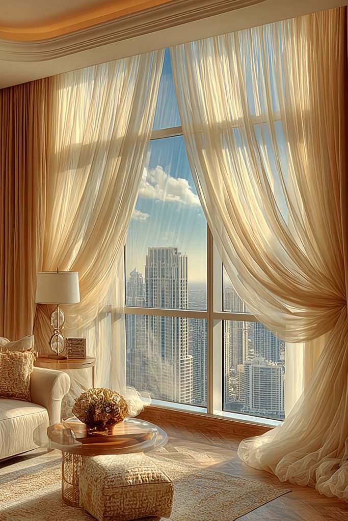 Imagine lightweight, semi-transparent fabrics in neutral or earthy tones gently billowing in the breeze. The curtains cascade softly to the floor, diffusing sunlight and casting a warm glow. When pulled aside, they reveal expansive windows that invite nature inside while providing privacy. The fabric’s texture adds a subtle tactile element to your decor.