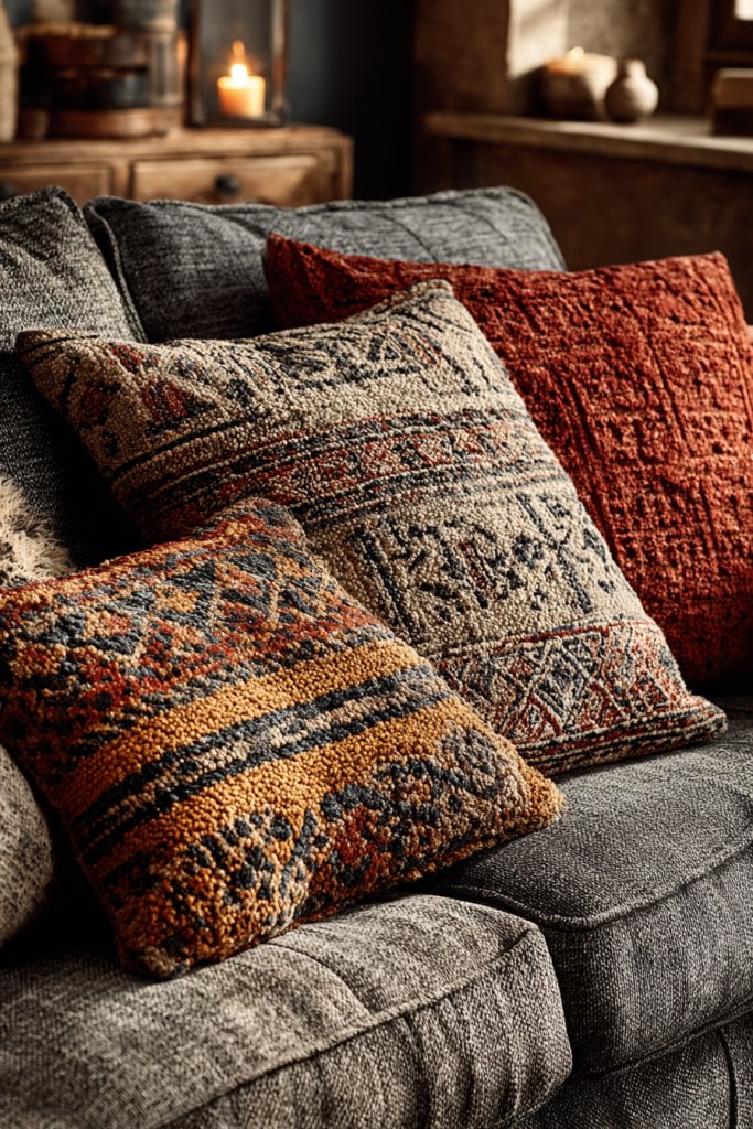 7. Textured Throw Pillows in Earthy Hues and Patterns
