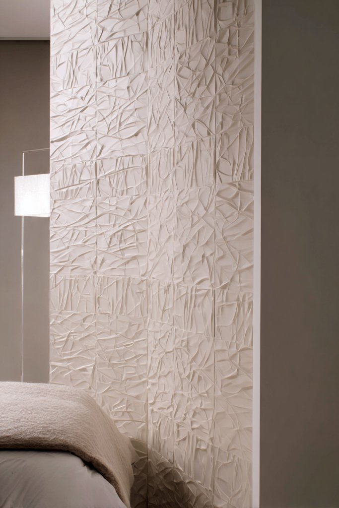 Visualize a wall covered in geometric 3D tiles or fabric-covered panels that catch the light at different angles. The textured surface adds tactile interest and visual complexity, making the wall pop. Soft ambient lighting highlights the textures, creating shadows and depth. The overall effect is modern, artistic, and inviting.