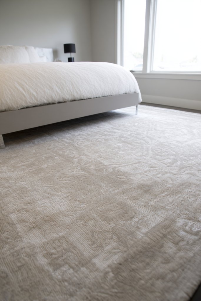 Imagine a plush, high-pile rug in shades of beige, cream, or soft gray, with delicate geometric or abstract patterns. It feels soft underfoot and visually anchors your bed and furniture. The subtle patterns add depth without overwhelming, creating a calm, cohesive look. The texture invites you to kick off your shoes and relax.