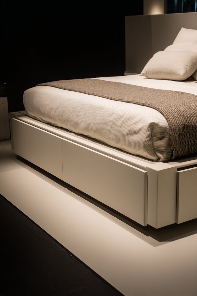 Visualize a low-profile, streamlined platform with a smooth, upholstered headboard. Beneath the mattress, drawers or lift-up compartments hide away your belongings, keeping the room tidy. The clean lines and minimal design make the bed appear as an elegant floating structure. Soft lighting accentuates the bed’s modern silhouette, adding a subtle glow.