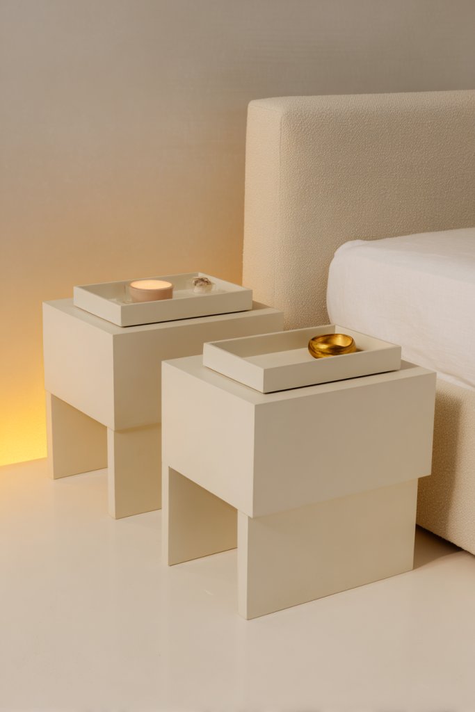 Picture a sleek tray in matte black or marble resting on your nightstand, holding a few select items—like a gold-rimmed glass, a candle, or a small sculpture. The tray anchors the items, preventing them from looking messy. Minimalist decor, such as geometric vases or sculptural objects, adds visual interest without overwhelming the space. The overall effect is tidy, elegant, and intentional.