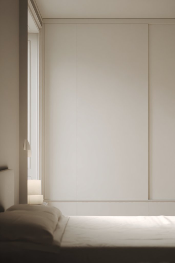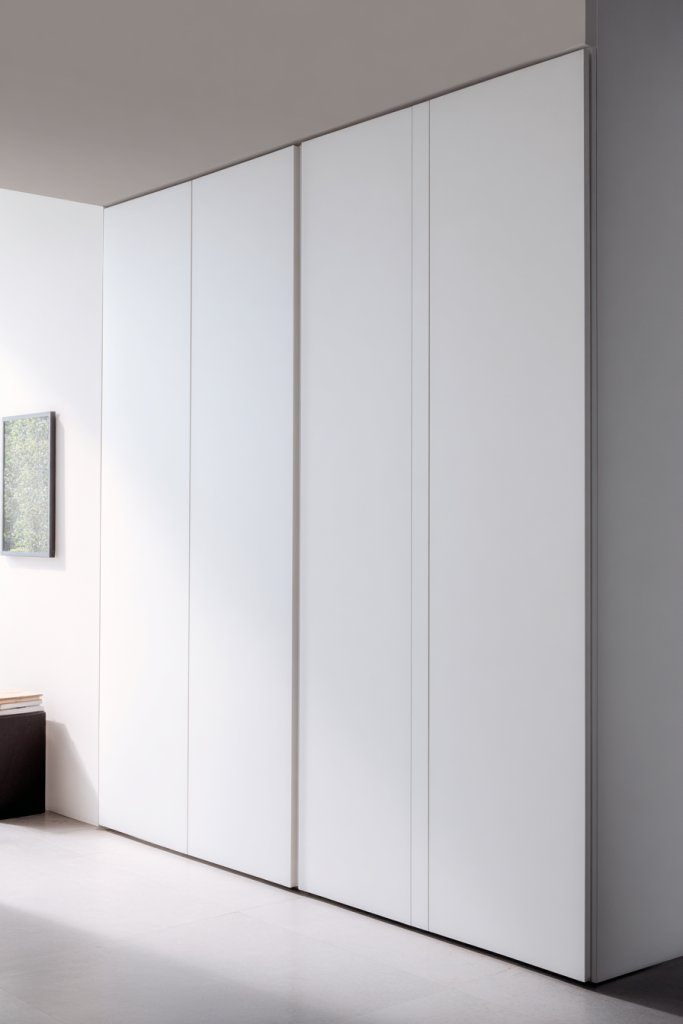 Visualize flush, handleless doors painted in the same color as your walls, blending into the room like a hidden wardrobe. When you press gently, the door pops open smoothly, revealing your organized closet. The lack of hardware keeps the space feeling open and uncluttered, with a subtle, contemporary vibe. The sleek surface reflects light, enhancing the room’s brightness.