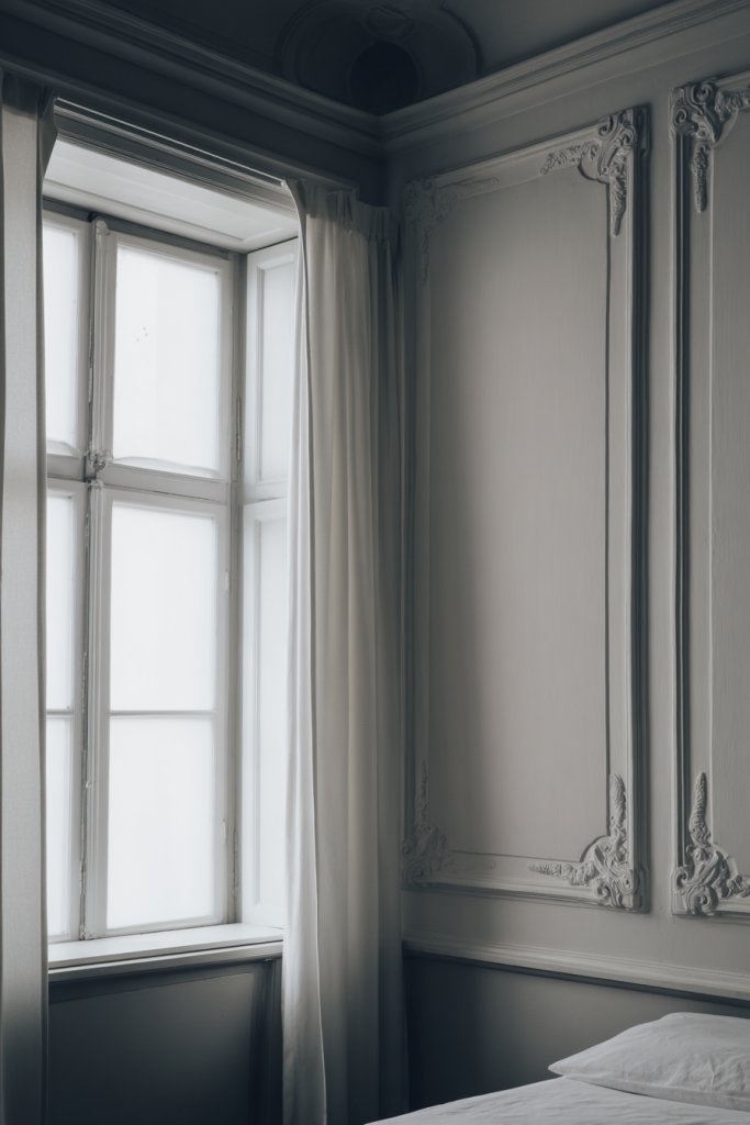 Imagine a window with a decorative, textured frame featuring intricate patterns or layered molding in a contrasting color. The molding casts gentle shadows that add depth, especially when paired with soft, diffused lighting. The textured window surrounds create a cozy, layered effect that draws the eye upward and frames the view beautifully. The walls themselves stay clean and simple, letting the molding be the star.