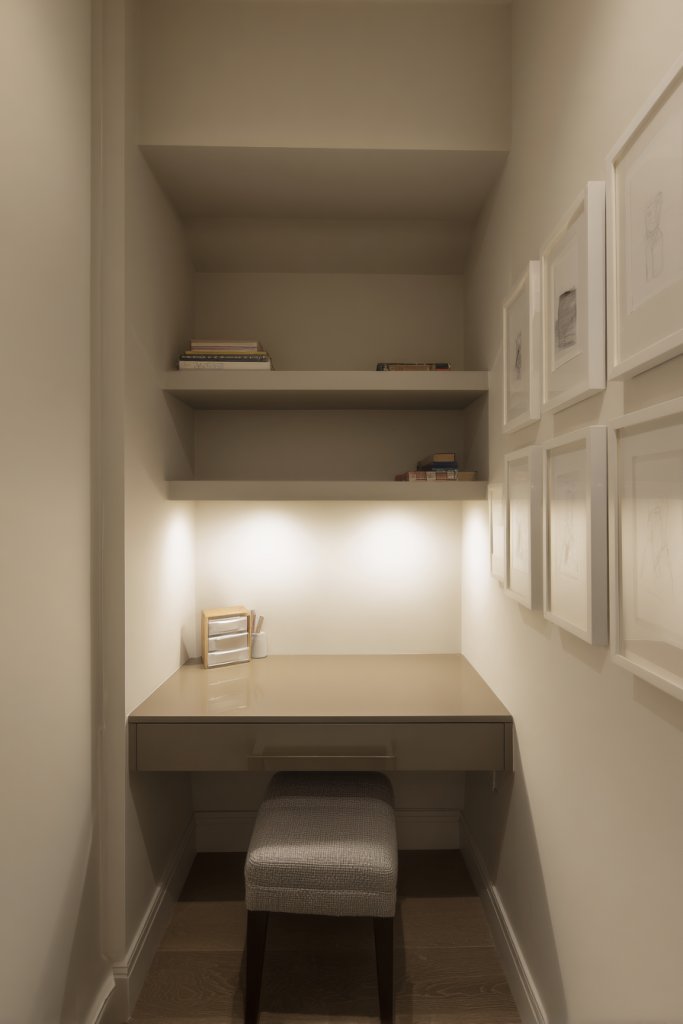 Imagine a streamlined, wall-mounted desk with a smooth matte surface in a soft neutral tone. A slim shelf above holds essential stationery in sculptural containers, while a cozy, textured cushion lines the back for comfort. Soft LED strip lighting highlights the area without harsh glare, creating an inviting nook. Subtle architectural details, like a floating panel or a hidden cable management system, keep it pristine. The overall look is modern, clean, and unobtrusive.