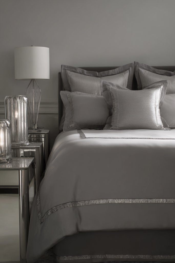 Picture crisp whites or soft grays layered throughout the room—think plush bedding, smooth wall finishes, and matte furniture. Metallic touches like brushed gold or silver hardware catch the light and add a subtle shimmer. The overall effect is a serene, polished space that radiates understated luxury. The textures and finishes interplay beautifully, creating visual depth without clutter.