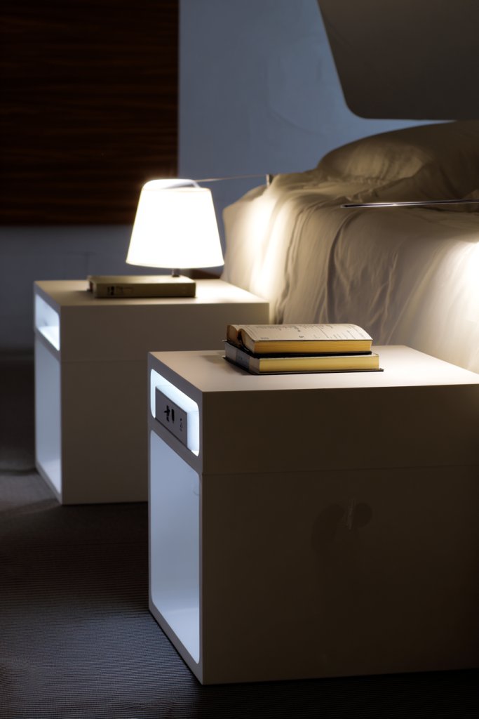 Visualize a minimalist nightstand with a smooth matte finish, featuring hidden USB ports on the side. A smart, compact lamp sits on top, casting a warm glow, while your phone charges discreetly through the embedded ports. The clean lines and neutral tones blend seamlessly into your bedroom decor, keeping everything within arm’s reach but out of sight. The overall look is modern, clutter-free, and efficient.