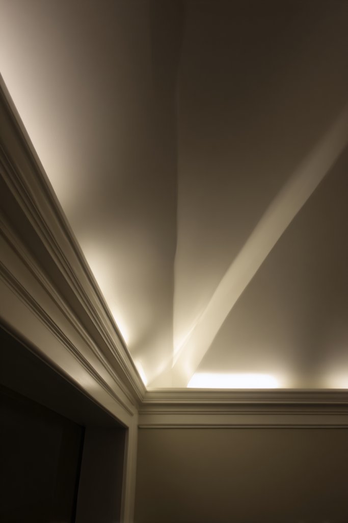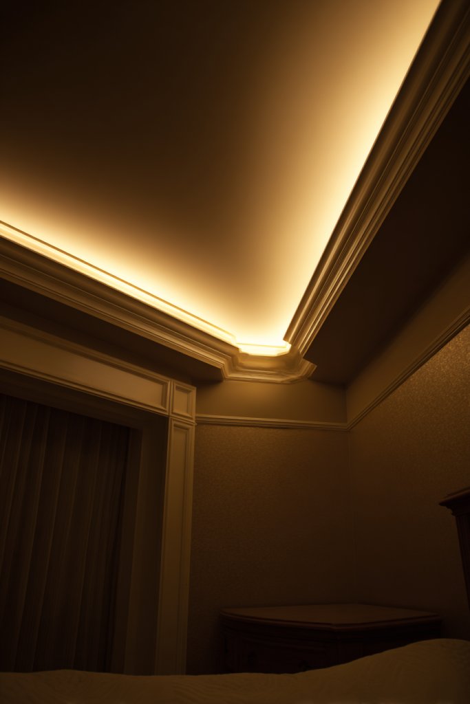 Picture a ceiling with layered molding or a coffered design, softly illuminated by hidden LED strips in the coves. The indirect light gently washes the ceiling, highlighting its depth and texture. Shadows cast by the architectural features add dimension, making the room feel taller and more spacious. The overall effect is sophisticated, with a cozy glow that sets the mood.