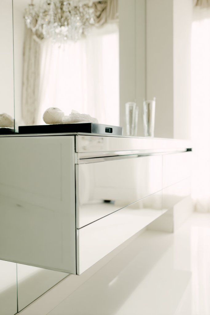 Choose a mirrored finish for a glamorous look or opt for matte or wood veneer for a more understated vibe. Floating designs work well in rooms with limited space, as they clear floor area for a more open feel. Add integrated lighting or LED accents to enhance the reflective effect and create a luminous ambiance. You can also pair it with a matching mirror or decorative wall panels for a cohesive aesthetic.