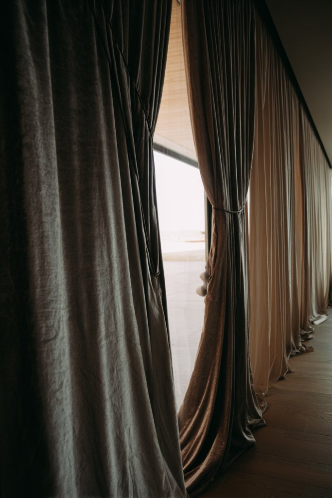 Envision floor-to-ceiling drapes in rich silk or velvet, flowing effortlessly when opened. Motorized rails hide discreetly behind the fabric or within ceiling recesses, activating with a remote or smartphone. The fabric’s subtle sheen reflects ambient light, adding depth and richness. The room feels polished, sophisticated, and effortlessly controlled.