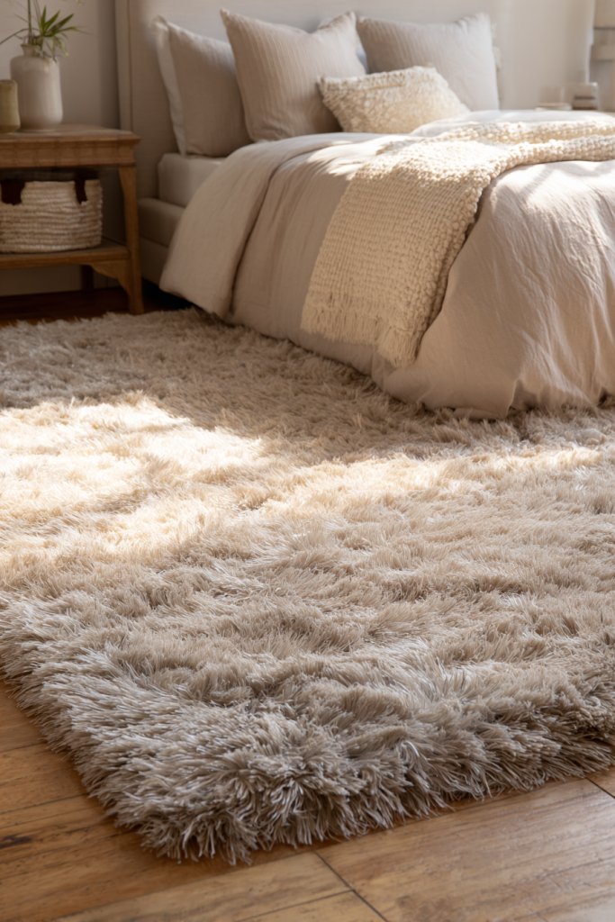 Picture a plush, high-pile rug in soft beige or stone gray laid beneath a sleek platform bed. Its subtle color enhances the room’s calm palette and provides a tactile contrast to smooth flooring. The rug’s texture invites barefoot comfort and softens the overall look. When complemented with simple bedding and furniture, it creates an inviting, cohesive space.