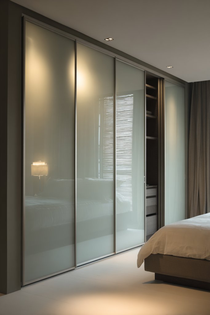Picture a closet with large, frosted glass doors that diffuse light softly, hiding the contents but maintaining a sleek silhouette. When closed, they reflect the room’s light and add a glossy, sophisticated element. When open, organized clothing and accessories are visible through the semi-transparent glass, creating a layered visual effect. This design balances functionality with style.