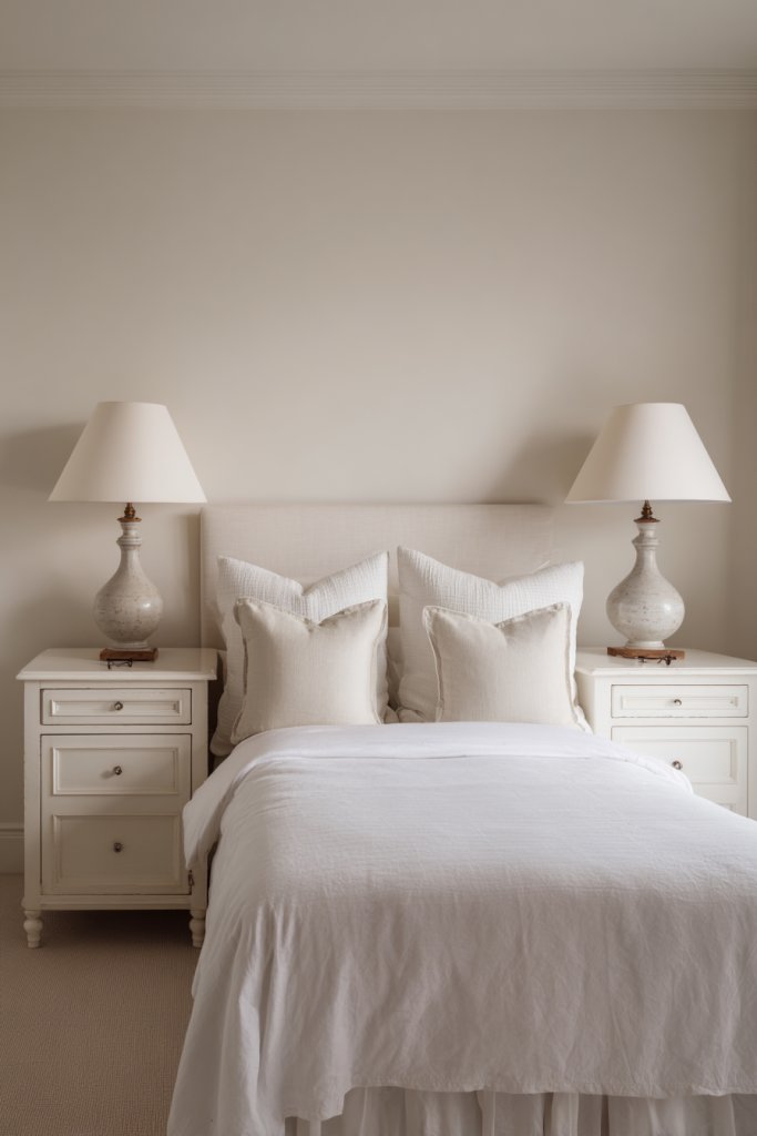Choose a neutral paint color that suits your lighting and mood preferences. Light colors like soft greige or warm white work well in small or dark rooms. Keep walls matte or eggshell for a non-reflective, sophisticated finish. Pair with light-colored furniture and bedding to maximize brightness. Consider adding a large mirror to amplify the effect and bounce light around. Regular touch-ups and avoiding overly busy patterns keep the look clean.