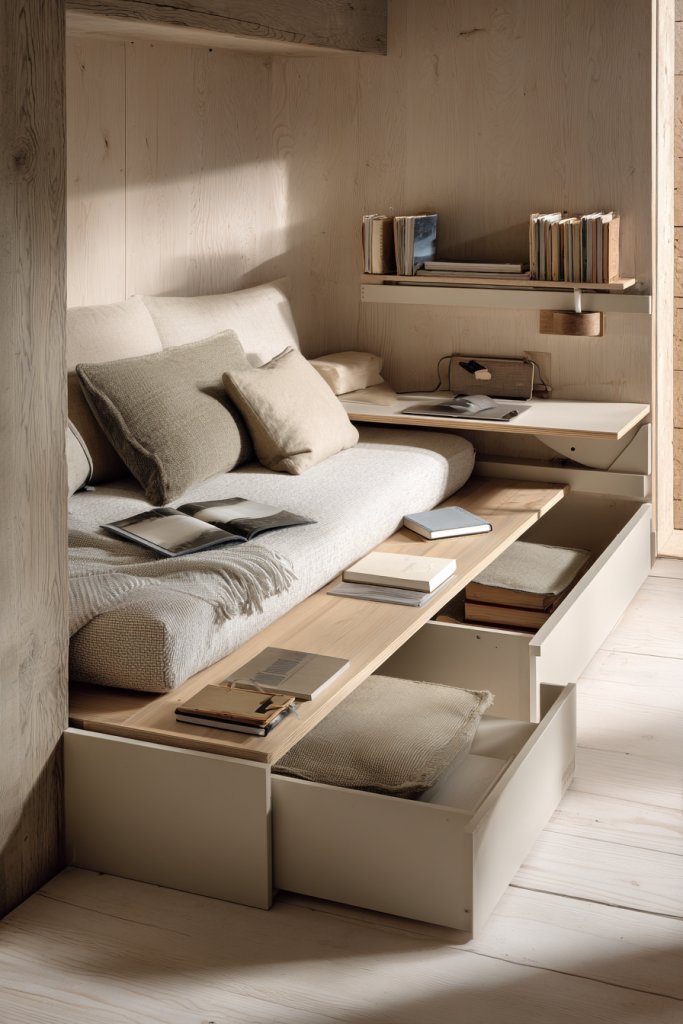 Imagine a bed with built-in drawers or a lift-up mattress for hidden storage. A bench at the foot of the bed doubles as seating and a place to store blankets or shoes. A nightstand with compartments or fold-out surfaces adds versatility. These pieces blend seamlessly into your decor, maintaining a minimalist look while providing maximum function.