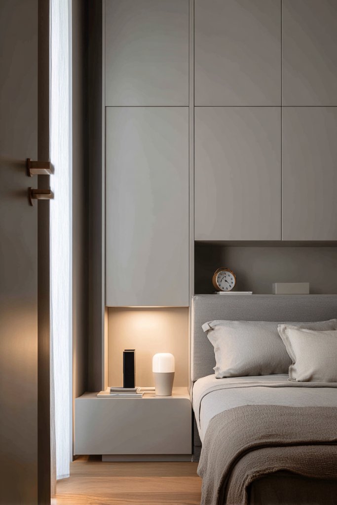 Picture a wall seamlessly integrated with custom cabinetry, painted to match the walls for a seamless look. Under the bed, drawers hide away seasonal clothes or extra bedding, while floating shelves hold essentials out of sight but within reach. The result is a clutter-free space with clean lines and no bulky furniture disrupting the flow. When everything has a designated spot, the room instantly feels more open and organized.