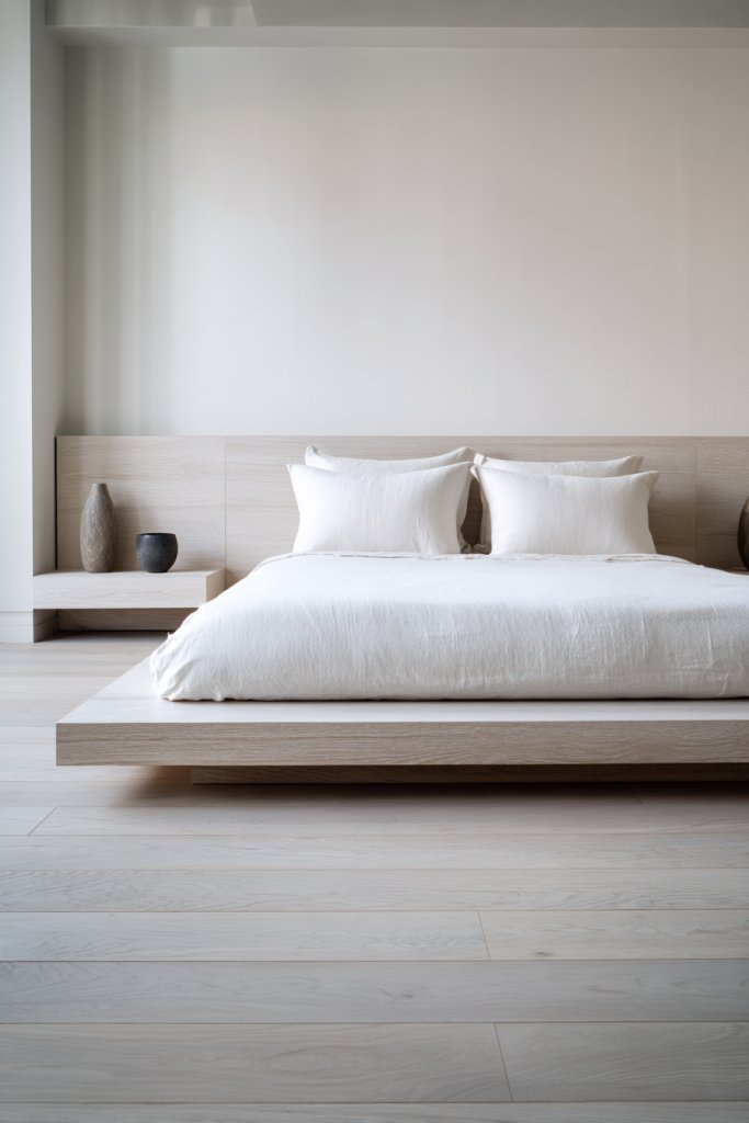 Imagine a platform bed with a thin, streamlined frame sitting close to the floor, complemented by minimalistic nightstands with clean lines. The absence of bulky headboards or ornate details keeps the focus on the space itself. Light-colored upholstery or matte finishes enhance the sleek look. The overall effect is a bedroom that feels open, calm, and effortlessly stylish.