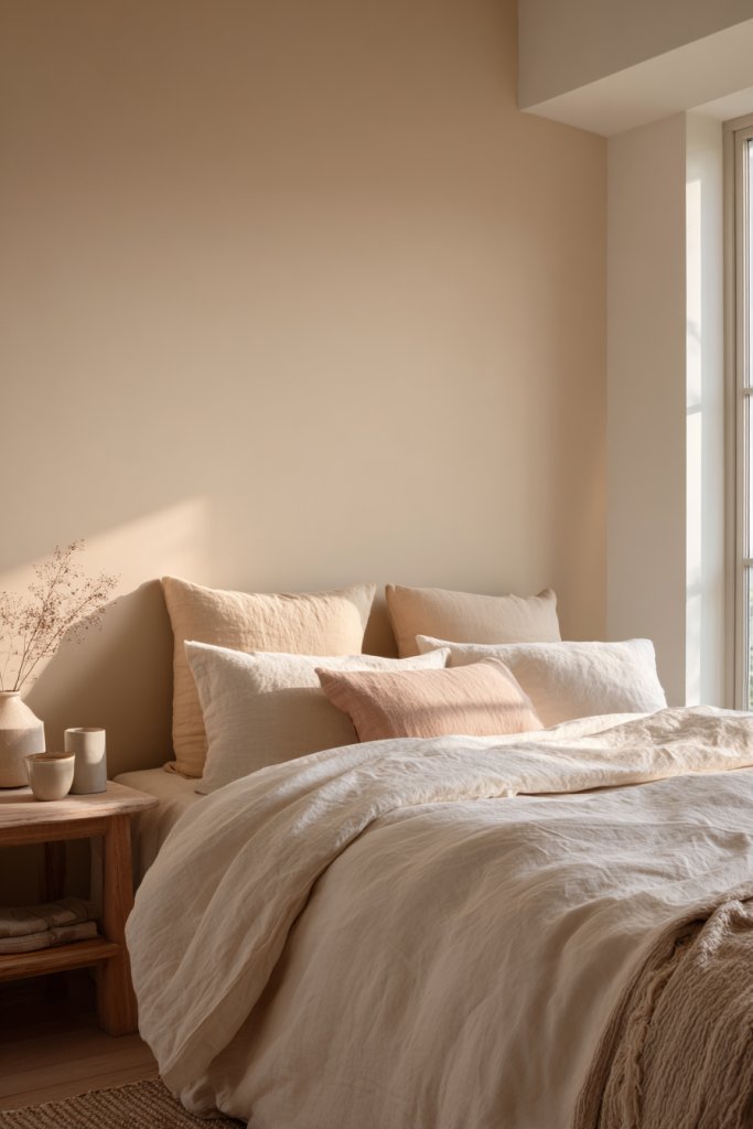 Picture walls painted in soft shades of beige, taupe, or light gray, serving as a subtle backdrop for your furniture and textiles. The room feels brighter and more expansive, especially when complemented by white or light-colored bedding. Natural textures like a woven rug or linen curtains enhance the understated elegance. The overall atmosphere is serene, calming, and inviting, perfect for unwinding.