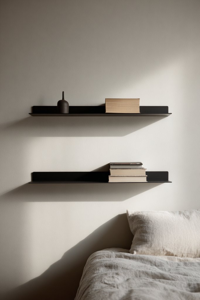Imagine thin, wall-mounted shelves in a matte black or soft wood finish, floating almost invisibly against neutral walls. They hold a selection of small, curated items—such as books, candles, or decorative objects—creating visual interest without clutter. The open design makes the room feel larger and more airy, especially when combined with strategic lighting. This simple addition transforms a plain wall into a focal point.