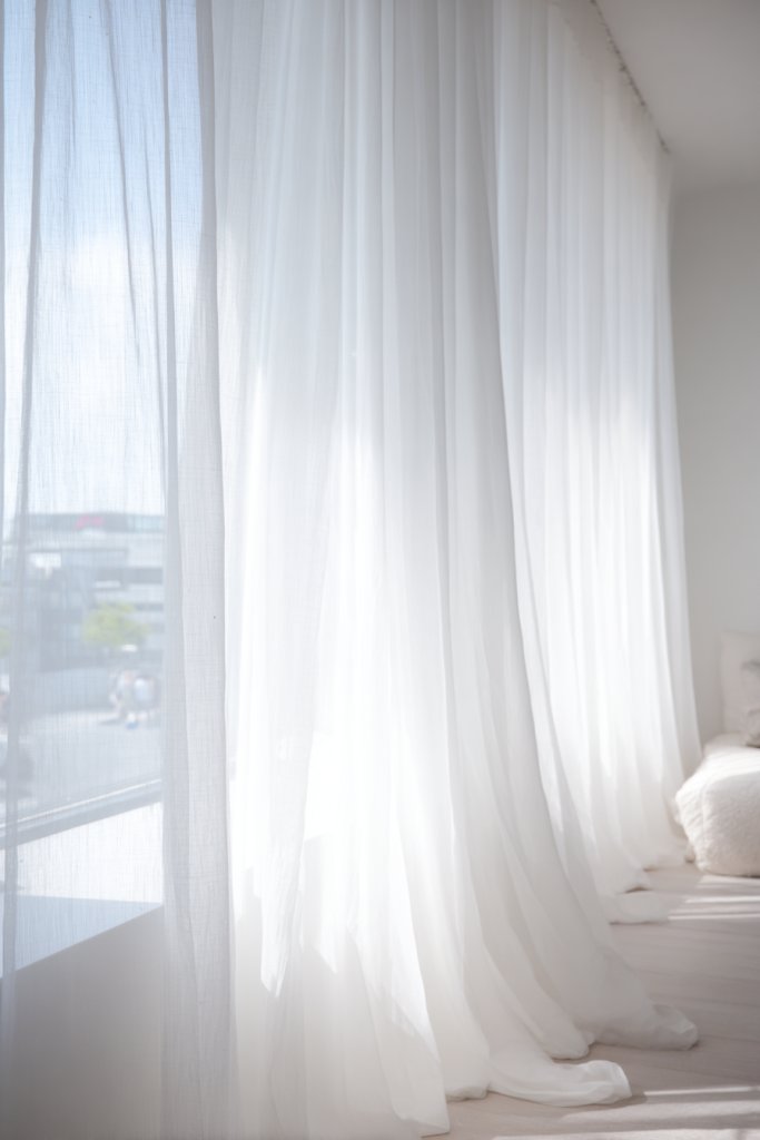 Imagine sheer curtains in a light, airy fabric gently billowing in the breeze. Their subtle texture adds softness to the room while diffusing sunlight beautifully. Light-colored blinds or translucent shades further soften the space without blocking out the glow. The overall effect is a luminous, serene environment.