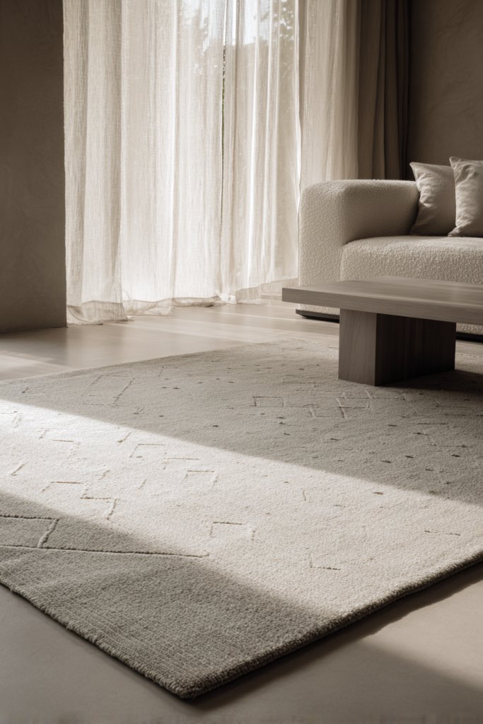 Picture a neutral-toned textured rug under a sleek sofa and coffee table. The rug’s soft pile invites bare feet, while its subtle pattern adds visual interest. The fibers, whether wool, jute, or synthetic, create tactile warmth that contrasts beautifully with hard flooring. Light reflects softly off the surface, making the space feel inviting and layered.