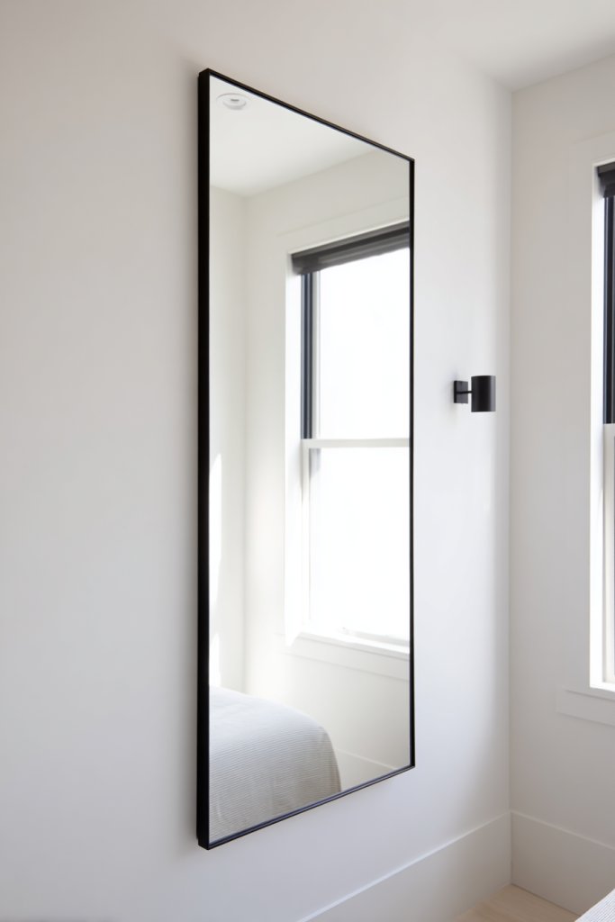 Visualize a sleek, frameless mirror hung vertically on a neutral wall. It reflects natural light pouring in from a window, amplifying the brightness. The clean lines and simple design keep the mirror from overpowering the room, instead enhancing its openness. The reflection also adds depth, making a small space seem expansive.