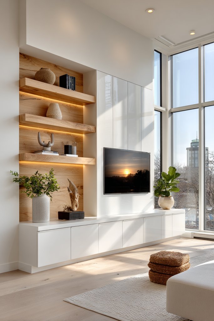 Picture a wall-mounted unit in matte black or natural wood, with hidden compartments for electronics and accessories. Imagine a TV floating above a low-profile console that appears to hover, creating a sense of openness. Visualize the play of light on clean lines and smooth surfaces, emphasizing the room’s spaciousness. This setup looks sophisticated and uncluttered, with everything neatly tucked away behind sleek panels.