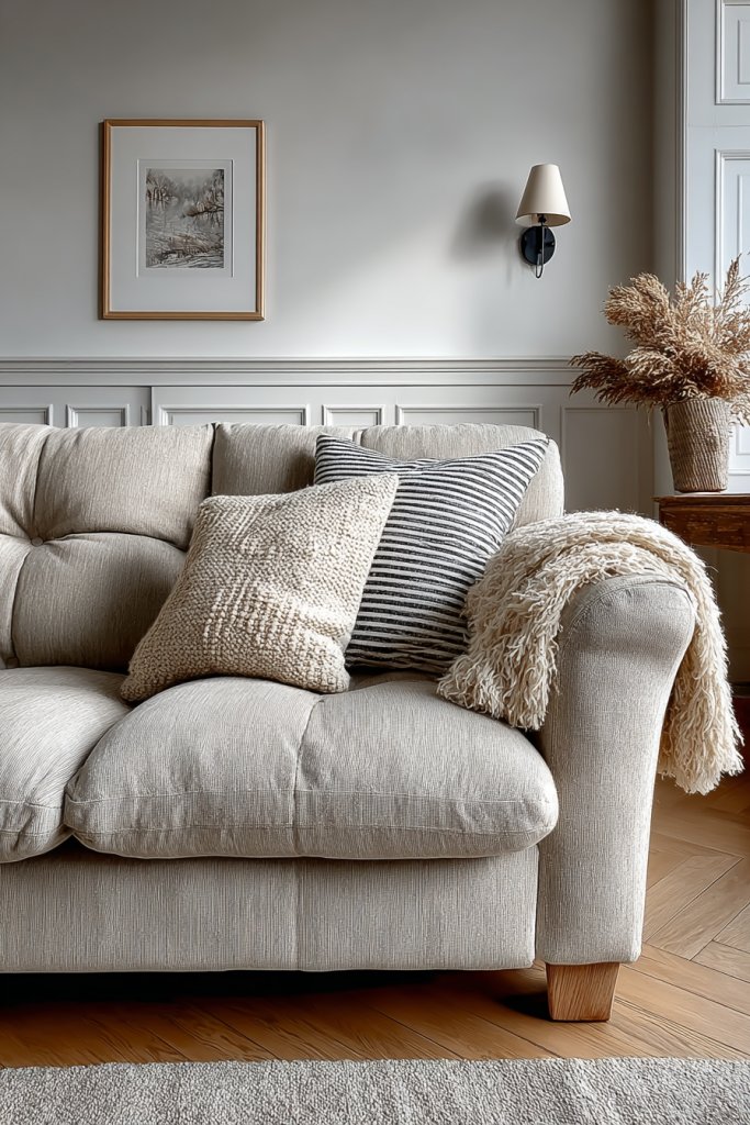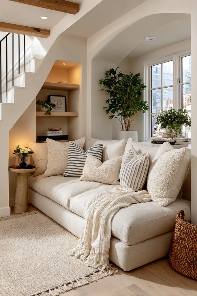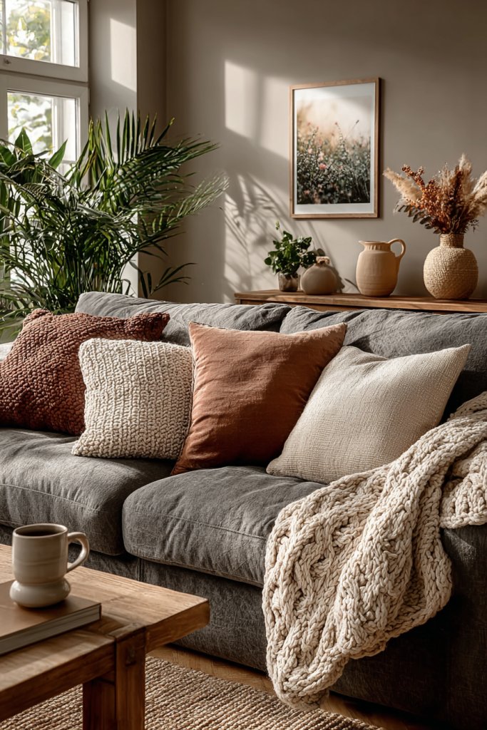 Imagine a soft cream throw blanket with chunky knit texture draped over a neutral sofa, adding cozy charm. Picture a geometric table lamp casting warm light over a side table, creating inviting ambiance. Visualize a decorative tray with a mix of candles, small sculptures, or framed photos, all arranged thoughtfully. These little accents make your space feel curated and personal, reflecting your taste and vibe.