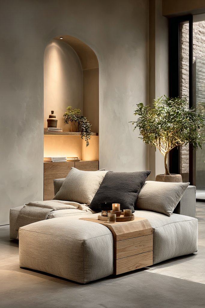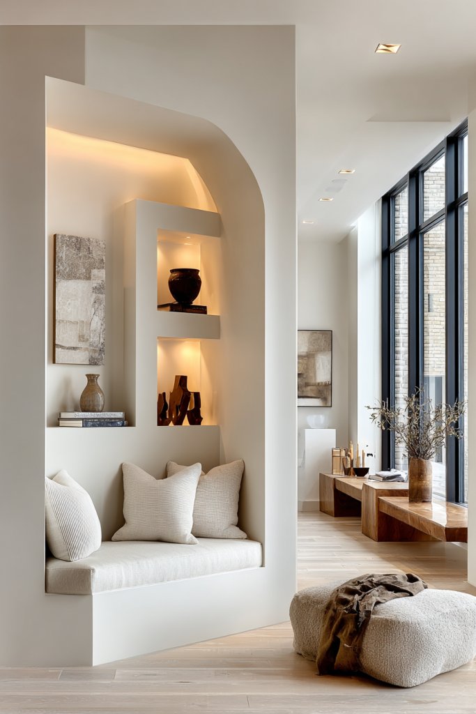 Imagine a wall with a series of recessed shelves filled with decorative boxes, books, and small objects in muted tones. Picture a niche built into a wall, housing your media equipment or accessories, with a clean, seamless finish. Visualize a bookshelf carved into a wall, with a minimalist design that looks both functional and sculptural. These hidden storage solutions create a polished, uncluttered aesthetic.