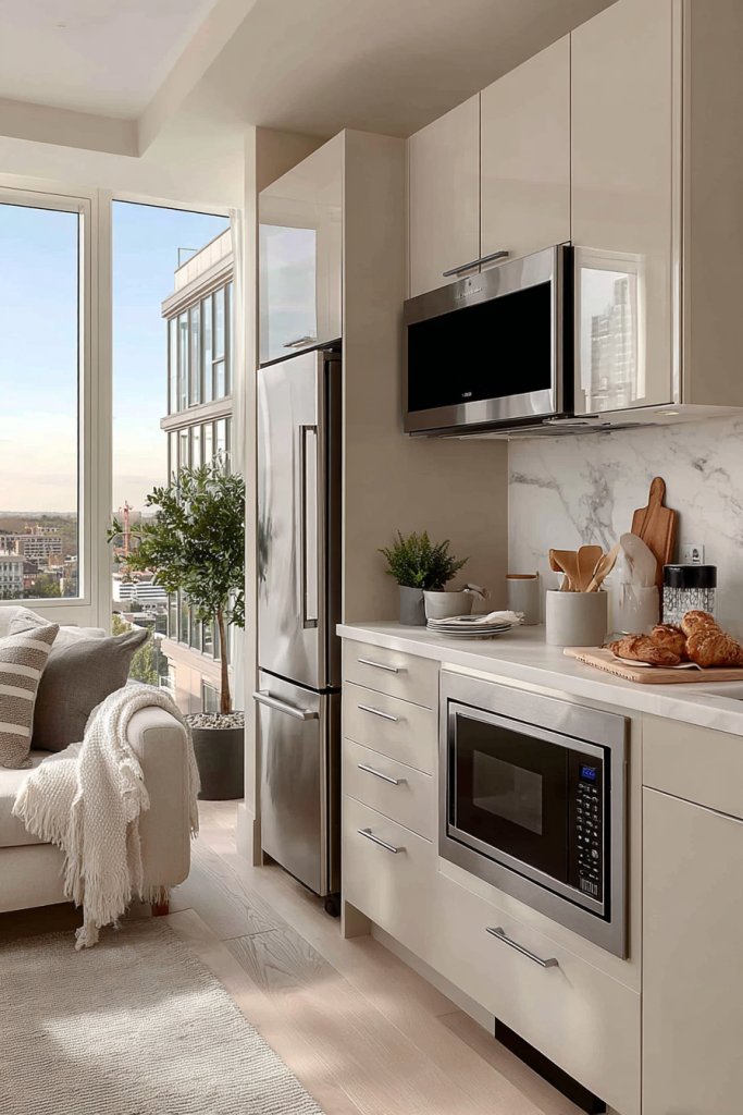 Imagine a flat-screen TV mounted flush against the wall with minimal cables visible, creating a seamless, modern look. Envision a slimline refrigerator with a sleek finish that blends into your kitchen cabinetry. Picture compact, lightweight speakers and soundbars that sit unobtrusively on shelves or mounts. These streamlined appliances keep your space open and clutter-free, giving your apartment a high-end, organized vibe.