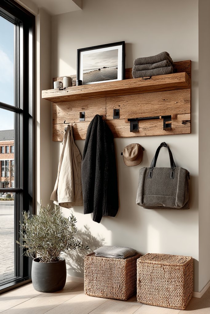Picture a row of sleek metal hooks holding your coats, bags, and hats by the door, keeping everything off the floor. Visualize a wall-mounted rack with small baskets or hooks for keys, scarves, or jewelry, creating an organized, decorative display. Imagine a series of wooden pegs arranged in an artistic pattern, adding personality and function. These solutions turn plain walls into practical, eye-catching features.
