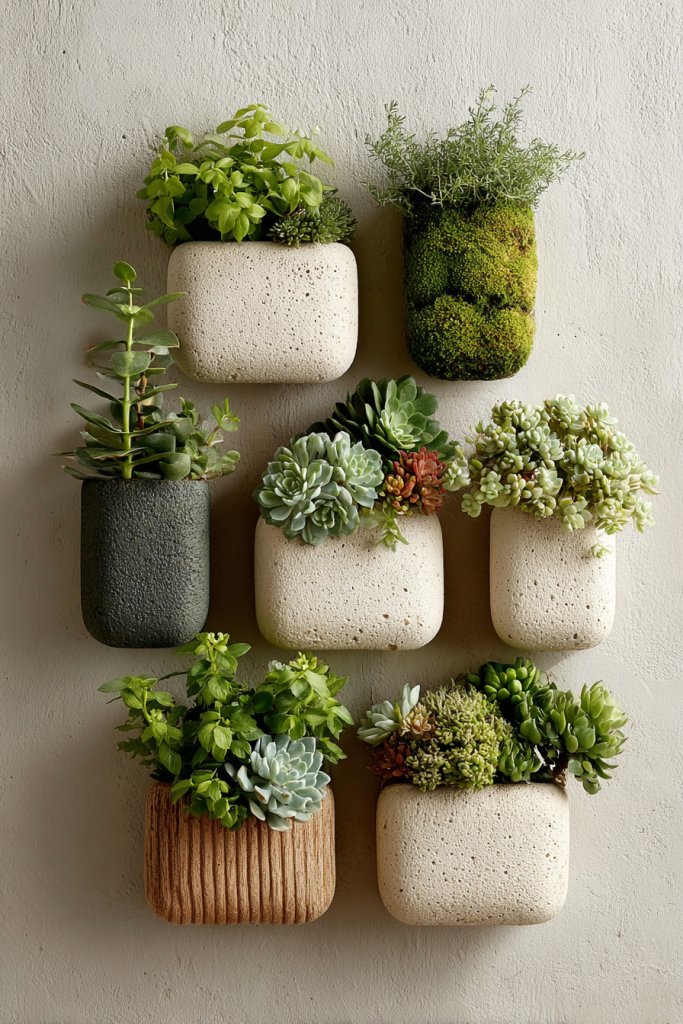 Imagine wall-mounted herb planters in sleek, geometric containers, adding fresh scent and color to your kitchen or living room. Picture a wall adorned with a series of small, framed artificial succulents or moss panels—low maintenance but full of life. Visualize hanging baskets filled with lush, trailing plants in baskets that don’t take up floor space. These vertical setups turn bare walls into lively, textured art.