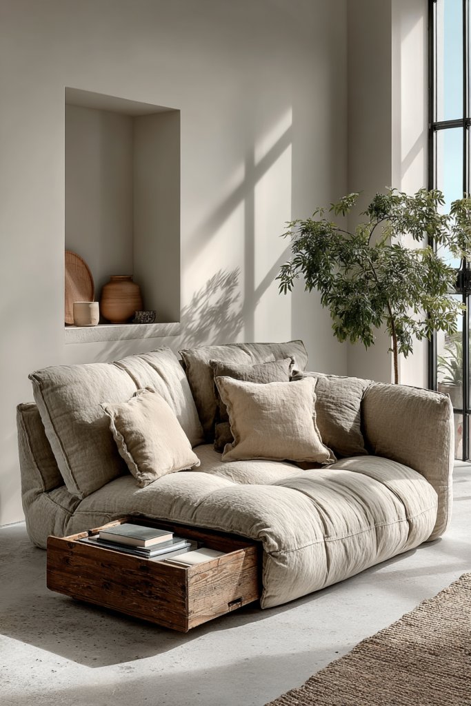Imagine a sleek sofa that transforms into a guest bed with a simple pull, revealing hidden compartments for linens. Think of a coffee table that lifts to become a dining surface, with a textured wood finish that complements your decor. Picture a minimalist ottoman that opens up to store blankets, with soft fabric upholstery in a calming neutral tone. These pieces look elegant and modern while secretly doubling their purpose, creating a seamless blend of form and function.