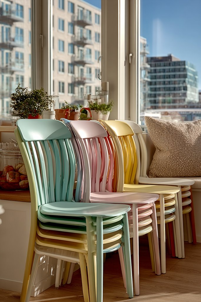 Picture sleek, colorful stackable stools tucked under a slim side table, ready for guests. Imagine a set of lightweight, modern folding chairs that can be stacked neatly in a closet or corner. Visualize a small, multi-tiered step stool that doubles as extra seating or a decorative accent. These options expand your seating capacity without cluttering your space, keeping your apartment open and welcoming.