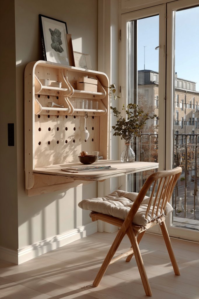 Envision a sleek, minimalist table with a smooth, matte surface that folds down flat against the wall. When needed, simply pull it out or unfold it to reveal a sturdy surface in a warm wood finish. The table’s legs tuck neatly underneath, leaving the floor clear. When folded away, it becomes virtually invisible, blending seamlessly with the room’s decor. It’s the kind of clever design that makes small living feel effortless.