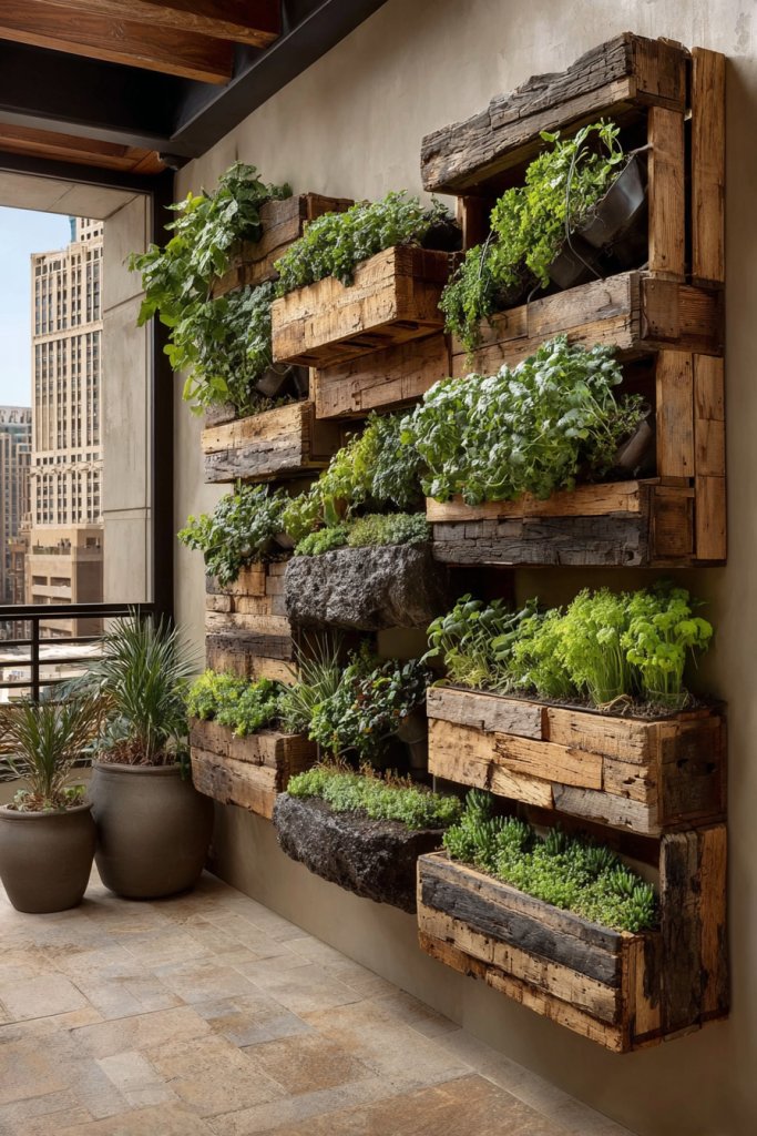 Imagine a blank wooden wall transformed into a vibrant tapestry of plants, all supported by reclaimed pallets. The rough texture of the wood contrasts beautifully with the lush, colorful foliage that cascades down. Sunlight filters through the gaps, casting playful shadows, while the scent of fresh herbs fills the air. It’s a living piece of art that makes your space feel alive and inviting.
