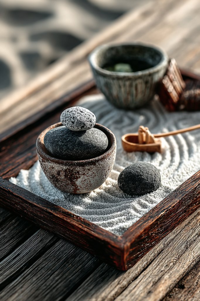 Imagine a shallow tray filled with fine gravel, carefully raked into calming patterns. Small, smooth stones are arranged thoughtfully around tiny sculptures or candles, creating a balanced, harmonious scene. The textures of the sand, stones, and optional plant elements evoke a sense of nature’s serenity. It’s a minimalist yet deeply soothing space that invites mindfulness and quiet reflection.