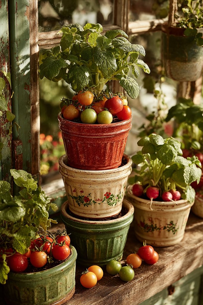 Visualize a cozy nook filled with colorful, stackable pots containing cherry tomatoes, radishes, and leafy greens. The plants are lush and vibrant, with ripe fruit or tender leaves ready to harvest. The pots are arranged in a tiered or clustered pattern, making the most of every inch. The scent of fresh herbs and vegetables fills the air, creating an inviting, productive outdoor space.
