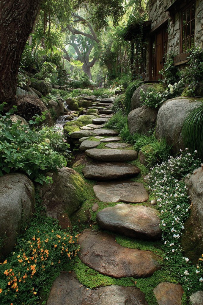 Picture a meandering path made of large, flat stones set into the ground, with lush ground cover or tiny succulents growing in the gaps. The stones are smooth and weathered, blending naturally into the landscape. The plants spill over the edges, softening the hardscape and adding texture and color. It’s a serene, inviting route that encourages exploration and relaxation.