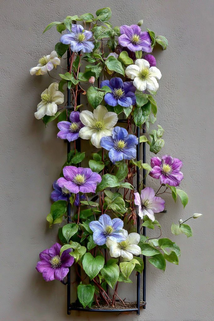 Imagine a delicate vine of jasmine or clematis winding up a sleek metal trellis against your wall or fence. The plant’s tendrils spiral gracefully, creating a lush curtain of leaves and blooms. The trellis supports the growth without crowding the ground, and the flowers add pops of color and fragrance. It transforms a plain wall into a living, breathing feature wall that invites admiration.