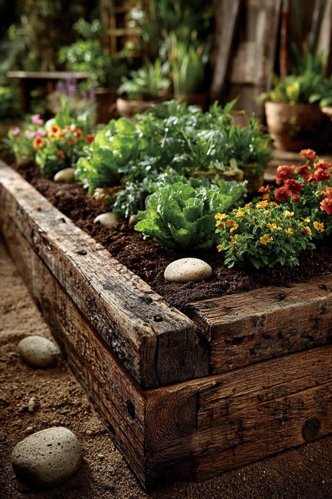 Imagine a compact wooden or composite box set just a few inches above ground level, filled with lush plants and rich soil. The clean lines and simple design blend naturally with your outdoor decor. The raised edges keep soil contained and weeds out, while the height makes gardening more comfortable. The beds are filled with vibrant greens and colorful blossoms, creating a tidy, inviting scene that’s easy to maintain.